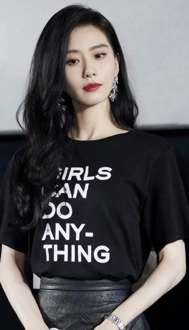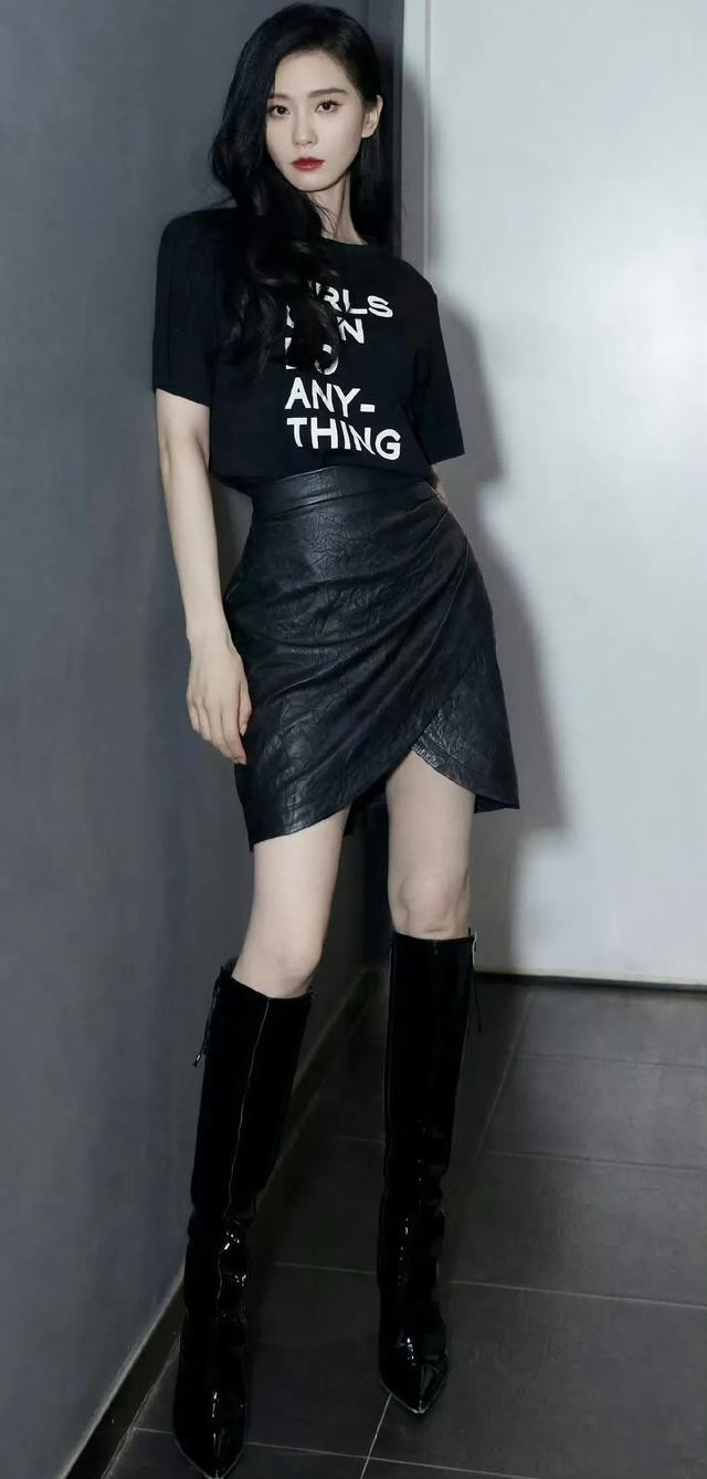刘诗诗黑色短袖T恤搭配黑色皮短裙,脚穿黑色长筒皮靴,身材高挑纤细,一双白皙修长美腿性感迷人,简直美翻了!